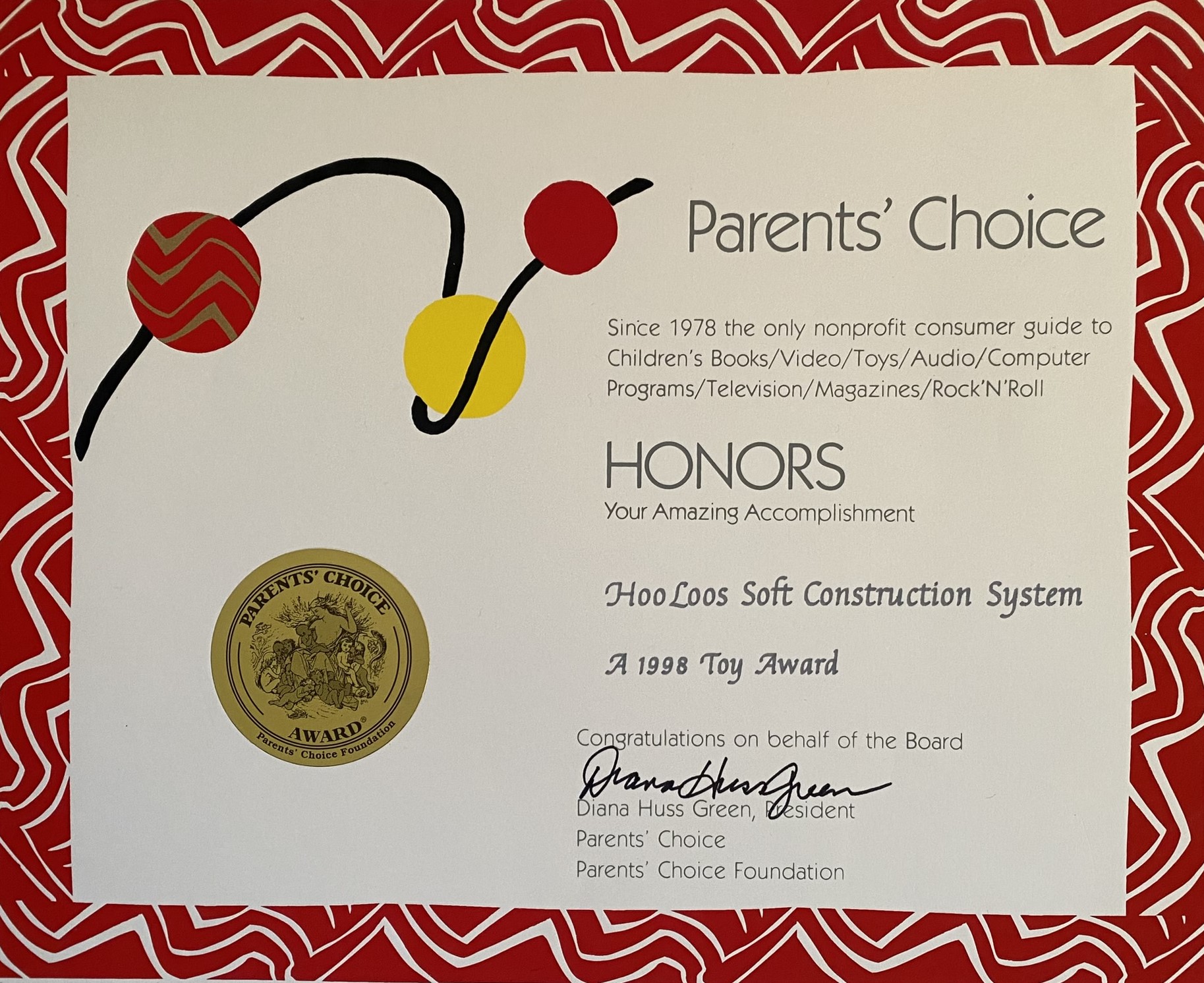 Together with Nadine, she was awarded two United States Utility Patents, the coveted Parents Choice Gold Award, and recognized in Parents, Parenting, and Sesame Street magazines, for the Velcro-based three dimensional play and mural system called HooLoos. The inspiration for the invention was born out of a design project for a day care center.